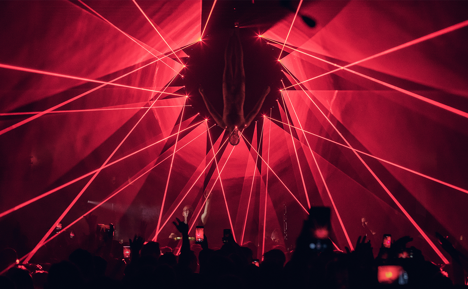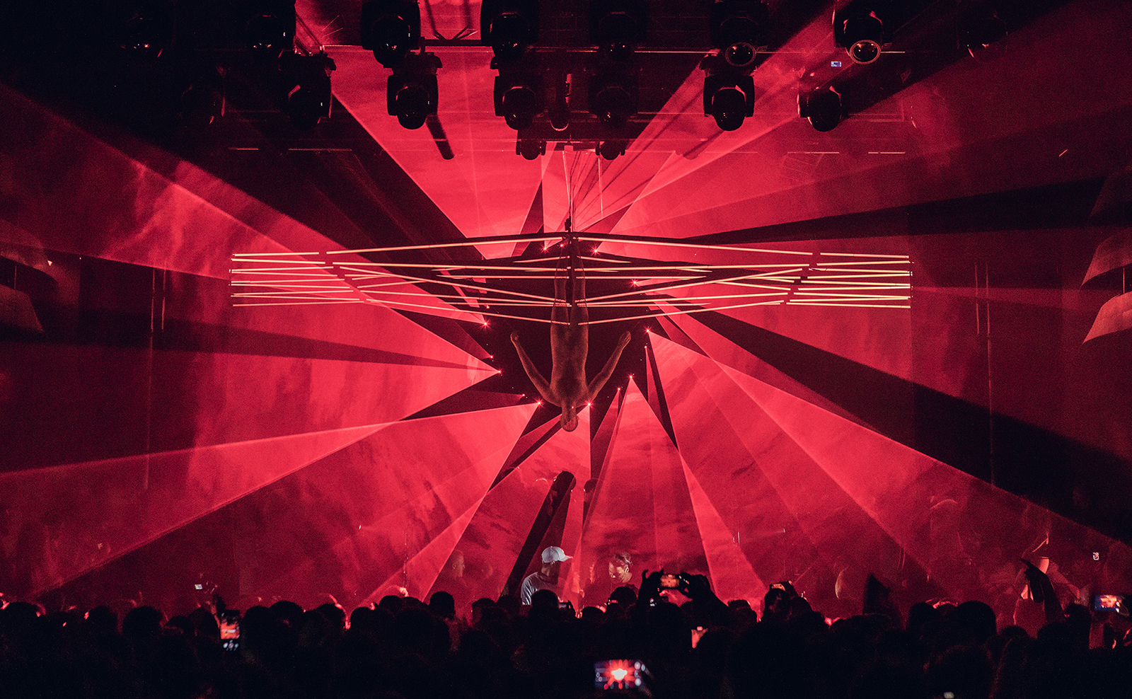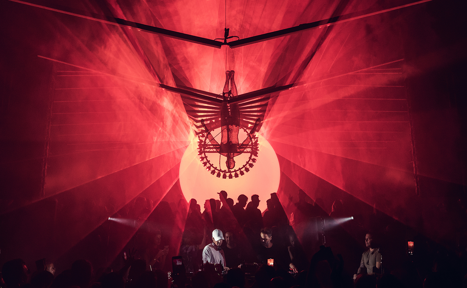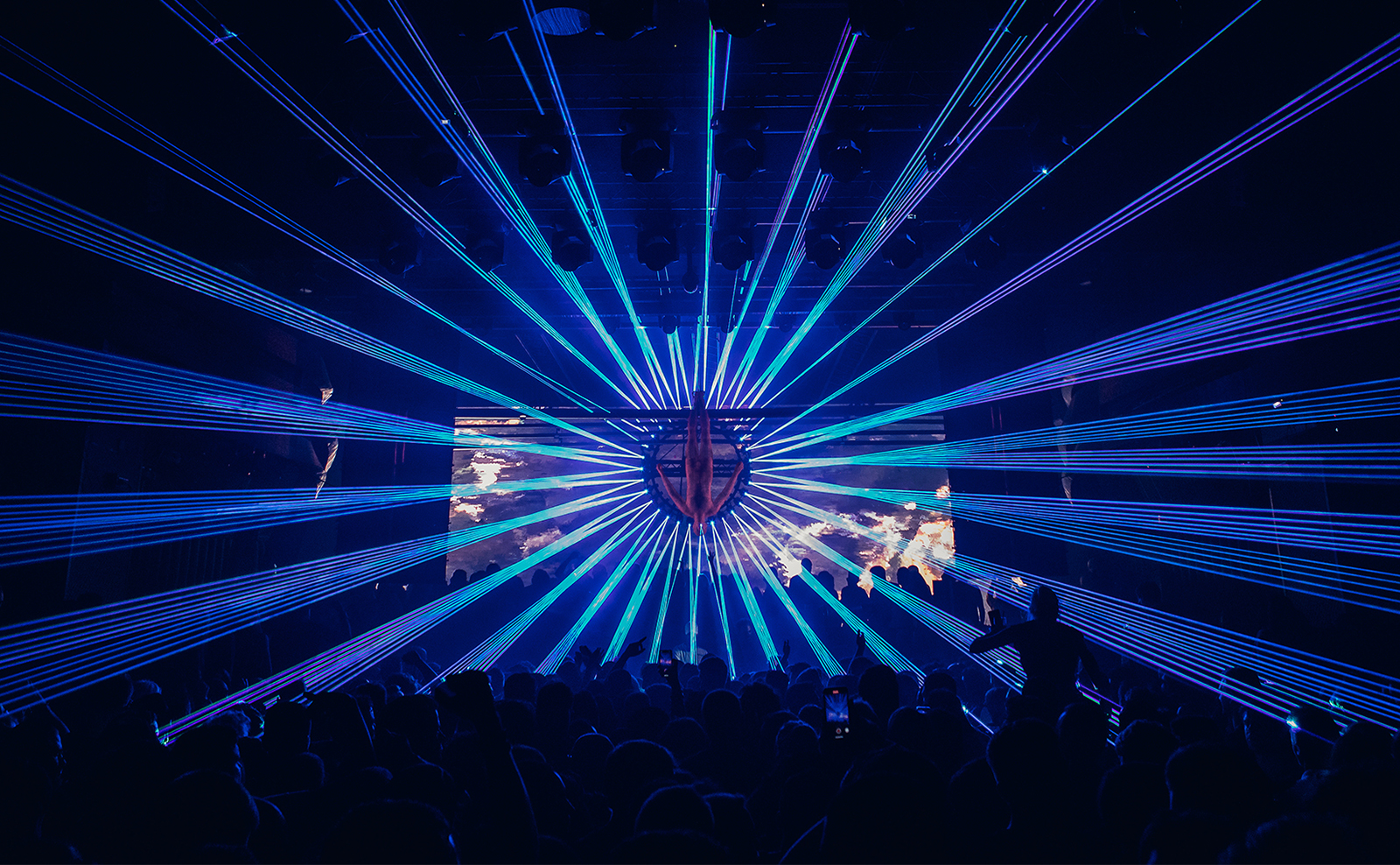 In addition, lasers cast a gate of light, illuminating the space from behind "the diver". Bodies of light shaped the audience’s journey away from reality, putting the clubber at the centre of the experience.