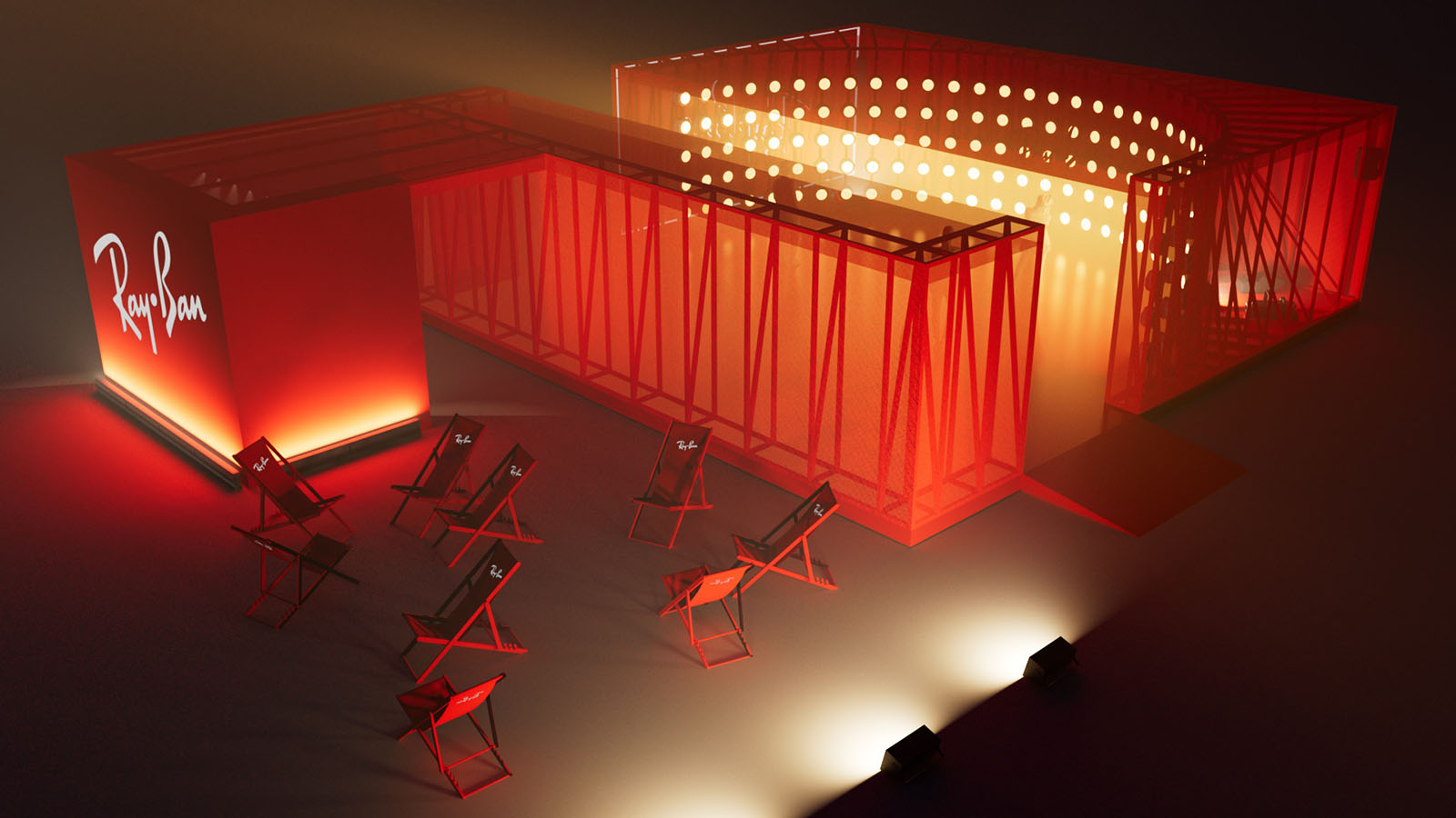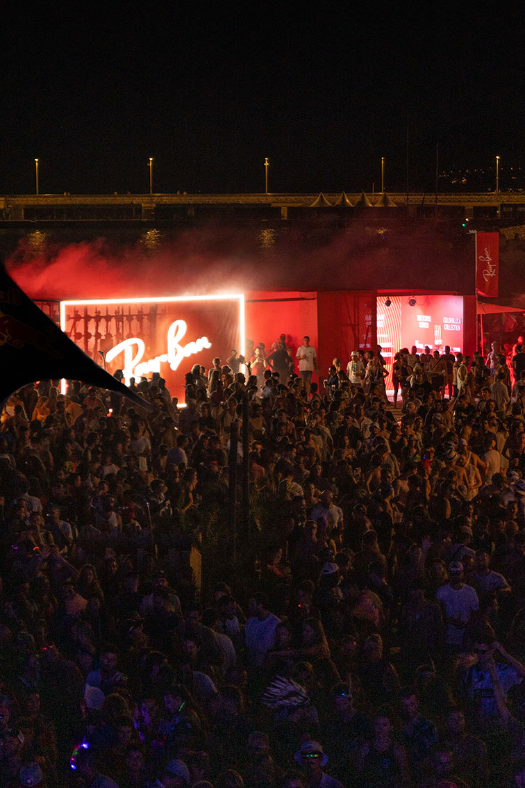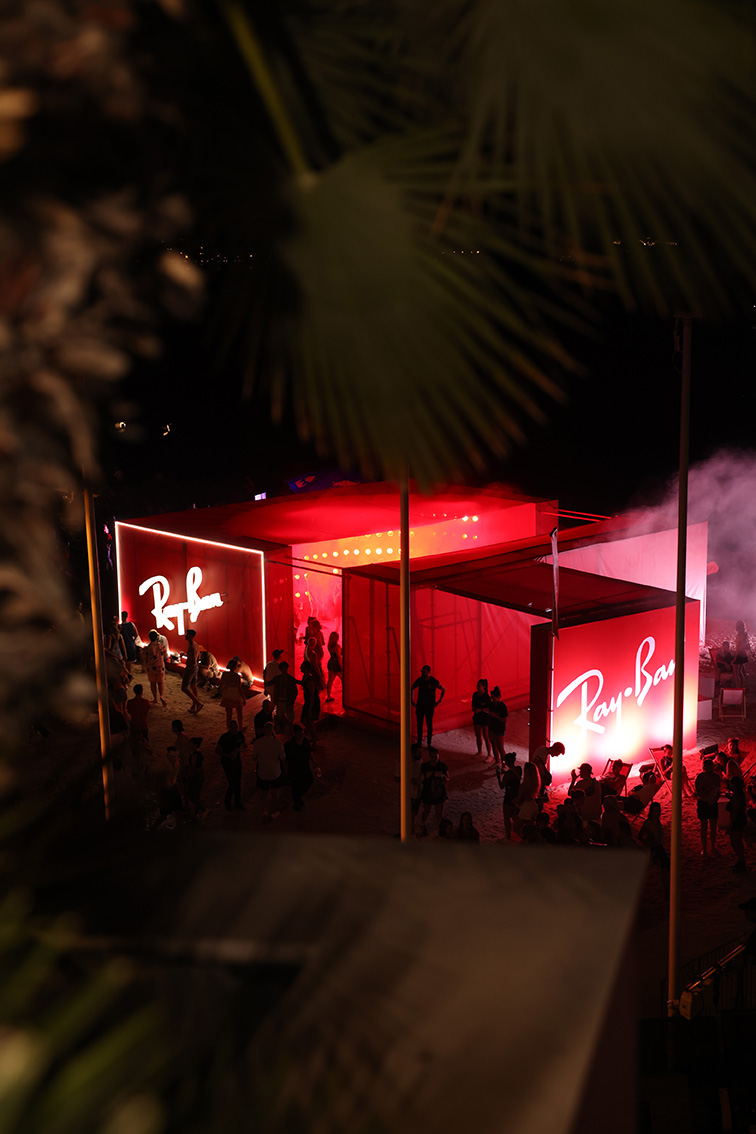 For the Ray-Ban activation at the Les Plages Electroniques Festival in Cannes, our main objective was to design a platform and stage that would heighten the bond between the iconic brand and music, resulting in a mutable space that would not only capture attention but also provide a transformative experience, reflecting the natural transition from day to night.